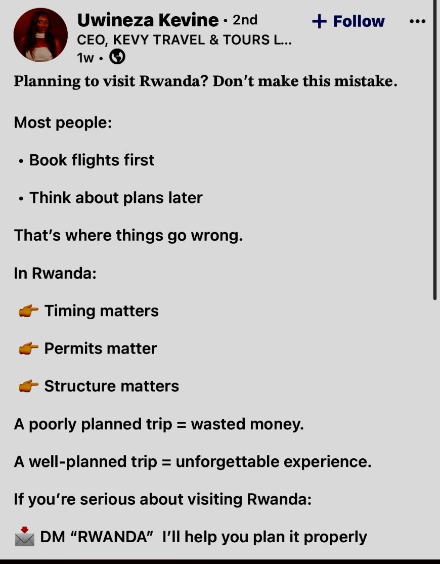 In a recent industry insight, Uwineza Kevine, CEO of Kevy Travel & Tours Ltd, highlighted a common pitfall for international travelers. Many tourists treat a trip to the "Land of a Thousand Hills" like a casual weekend getaway, only to find themselves locked out of the country’s most iconic experiences.